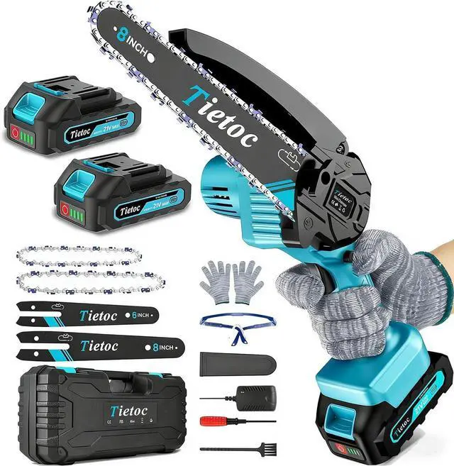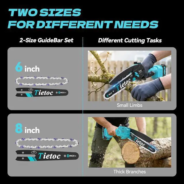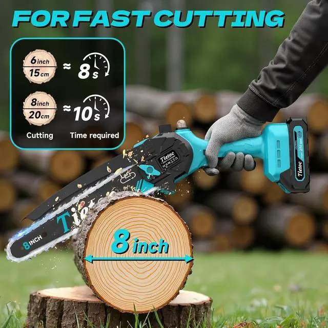 [Lightweight Electric Chain Saw - Women Friendly]: Lightweight, comfortable, yet sturdy - The Tietec 8inch & 6-inch mini chainsaw is lightweight and portable (only 2.95 pounds/ 1.33 kilograms, which is 25% of the weight of bulky large air chain saws). Unlike full-size chain saws, it does not require dragging electical cord. Its ergonomic design reduces operational fatigue, improves grip comfort, and is less prone to fatigue during long-term use, allowing elderly people or women to easily trim garden branches. small chainsaw is a beautiful Christmas gift for men, suitable for fathers, mothers, friends, husbands, DIY enthusiasts, and gardeners