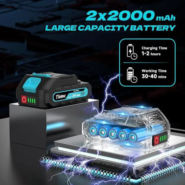 Operation]: We have equipped this cordless chainsaw with 2 sets of 21V 2000mAh rechargeable high-performance lithium battery packs, with a charging time of 1.5 hours, providing uninterrupted use for up to 30-40 minutes. The battery is equipped with functions such as battery level display, overload and overcharge protection, and temperature control system, aiming to maximize the service life of the battery. Very suitable for long-term garden pruning, logging, tree branch pruning, and outdoor projects, it ensures that you can work without frequent charging