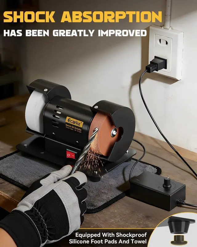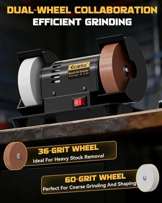 Dual Grinding WheelsThe 36-grit red wheel delivers efficient stock removal for aggressive shaping and heavy deburring, while the 60-grit white wheel excels in refined edge profiling, surface smoothing, and general tool conditioning.