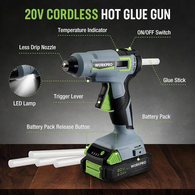 20 V 2.0 AH Large Capacity Battery: This full-size hot glue gunkit comes with a 20-Volt 2000 mAh large-capacity Li-ion battery, so you never need to worry about running out of power in the middle of a project. 2.4 A fast charger can charge one battery in as little as 1 hour. The release button on the battery provides safety for use