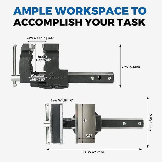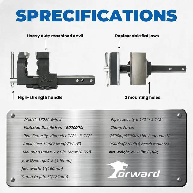 Clamping Force: 2500kg (5500lbs) hitch mounted/3500kg (7700lbs) bench mounted