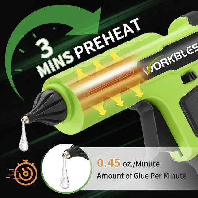 HEAT READY BEFORE YOUR COFFEE Beat the clock! This hot glue gun cordless features blazing-fast 2-3 minute heat-up melts adhesive quicker than microwave popcorn. The ultimate choice for last-minute DIY projects or emergency fixes, made possible by its cordless design.