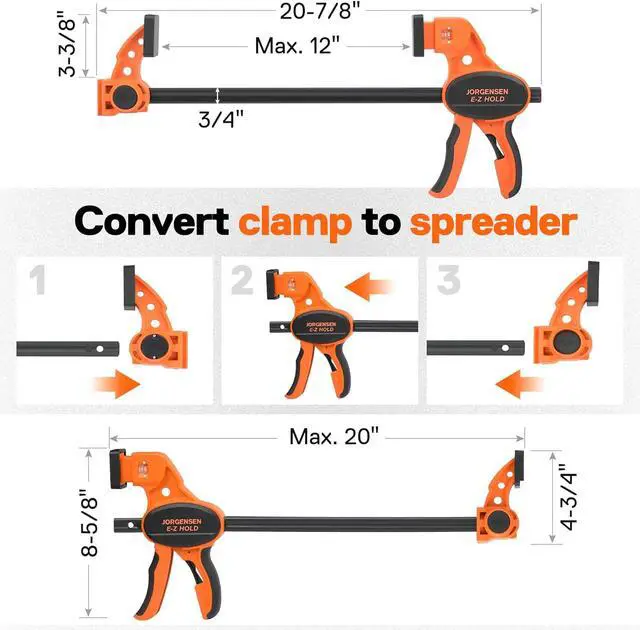 Features: Reinforced nylon handle and blackening surface bar with high frequency heat treated make the clamp strong and durable. The comfort grip and quick-release design make it simple to get a firm grasp. Removable and deep-reach jaw pads help to protect your work