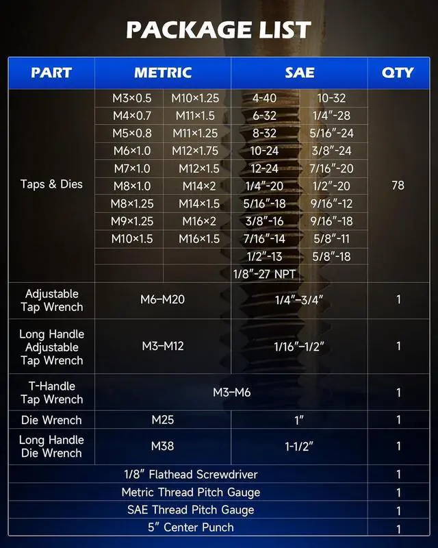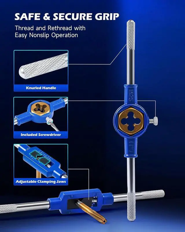 Helpful Accessory Tools: The tap and die wrenches securely hold taps and dies of various sizes during threading, featuring knurled texturing for a firm grip. Two thread pitch gauges simplify size identification, ensuring precise threading compatibility