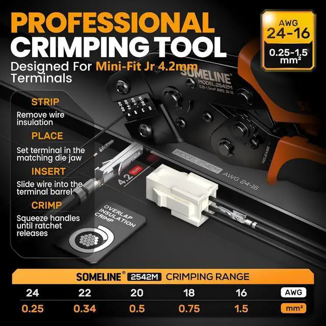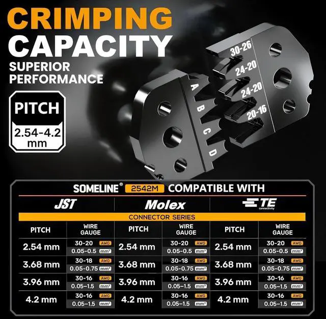 - Wide Compatibility: Crimps Molex Mini-Fit Jr 4.2 mm, Molex Standard. 062" ( 3.68 mm), Dupont 2.54 mm, KF2510, and KK 254 connectors.