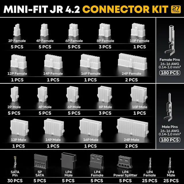 COMPATIBLE WITH MOLEX MINI-FIT JR: Engineered for a perfect fit. All housings and terminals in this kit are fully compatible with Molex Mini-Fit Jr 4.2 mm series connectors. Our Tin-Plated Brass Terminals match the specifications of standard OEM power supply cables, offering reliable conductivity and oxidation resistance for PC builds and electronics projects