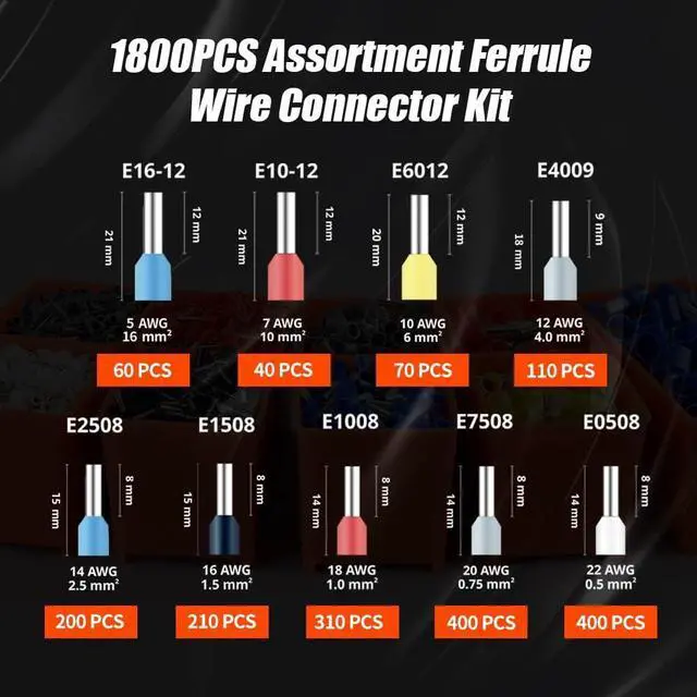 Ferrule Crimping Range AWG30 - 5 ( 0.08~16mm² ). Each kit comes with a ferrule crimping tools with 1800pcs wire ferrules terminals