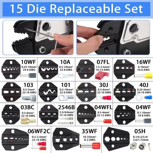 Compatible terminal sizes: non-insulated terminals 0.5 - 16.0 mm², pre-insulated terminals 0.5 - 6.0 mm², tubular terminals 0.5 - 35.0 mm².