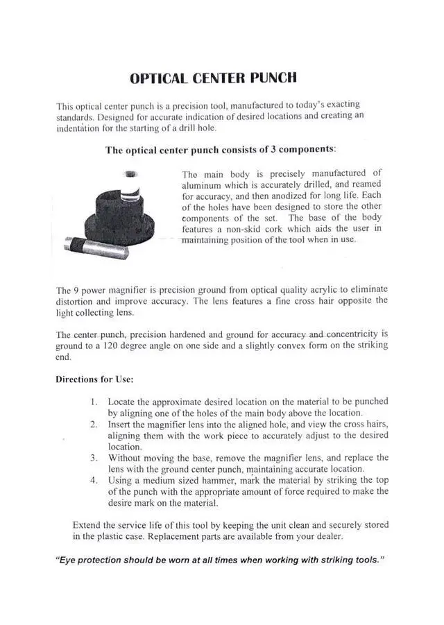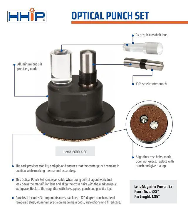 Achieve unmatched layout precision with the 8600-4120 Optical Center Punch Set, a 3-piece precision tool designed for machinists, engineers, and craftsmen who demand exact accuracy. This set merges optical clarity with mechanical durability, delivering dependable performance on metal, wood, and composite materials. The optical viewing lens with 9X magnification allows users to align crosshairs perfectly to the target point, ensuring pinpoint accuracy before marking. Once aligned, the 3/8-inch 120° center punch transfers the mark with a light hammer tap, achieving location precision within ± 0.002 inches. Built for long-term use, the tempered steel punch resists wear and deformation, while the anodized aluminum body ensures corrosion resistance and precise component fit. A cork-lined base enhances grip, stability, and protection from surface scratches during setup. Compact and portable, it includes a fitted storage case for safe organization and easy transport. Ideal for toolroom layout, metalworking, fine woodworking, and jewelry marking, this optical punch set eliminates guesswork and enhances repeatability across every project. Combining rugged construction, precision optics, and ergonomic performance, the 8600-4120 Optical Center Punch Set is a must-have for any professional workshop seeking accurate hole positioning, reliable marking, and repeatable high-precision layout work.