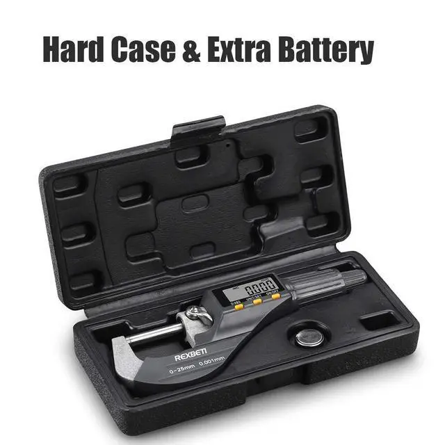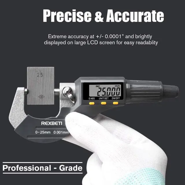 outside micrometer is a professional measuring tool. With accurate to 0.0001", You can get the most presicion measurements from the large clear LCD display. Comes with a hard and tough case for storage and protection.