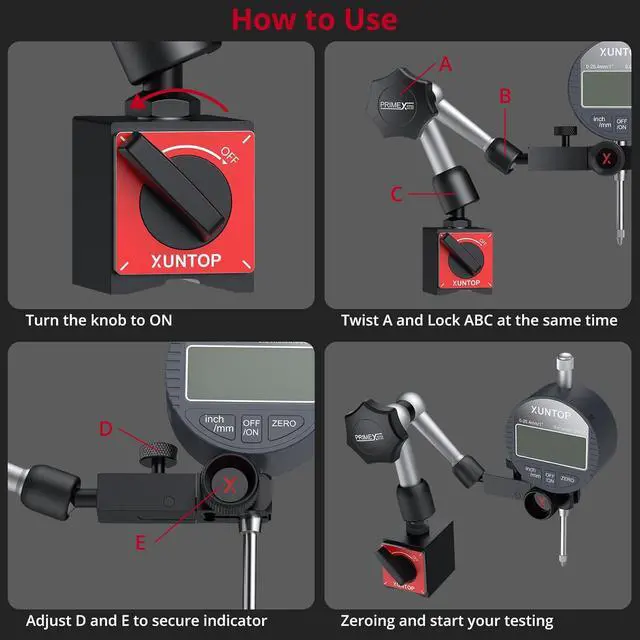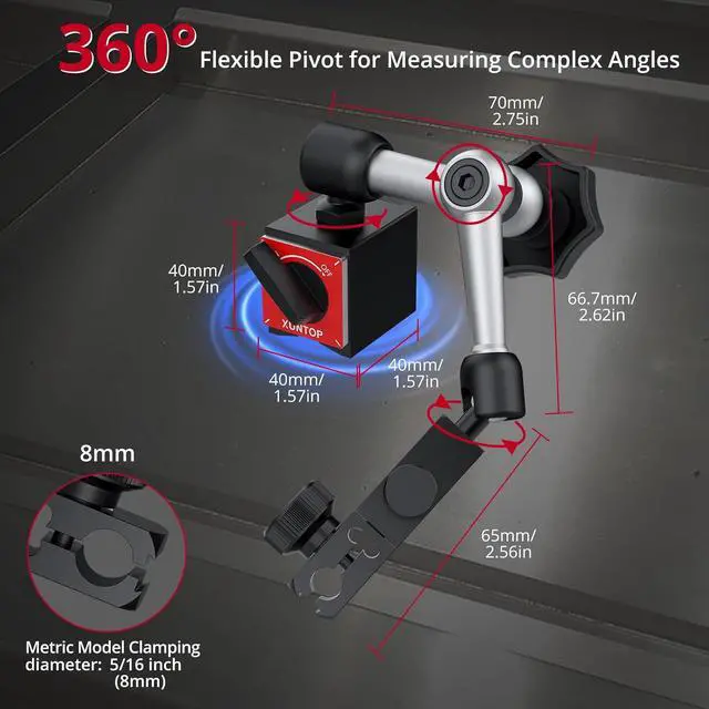 Flexible Arm with 3 Joints: dial indicator magnetic base features 3 rotating joints and 5/16 (8 mm) clamping diameter for accessing tight spaces like motor cavities or gear assemblies. The compact design enables measurements where standard holders cannot reachNOTE: Rotate 'PRIME 90lbs/40kg' knob to lock base arm