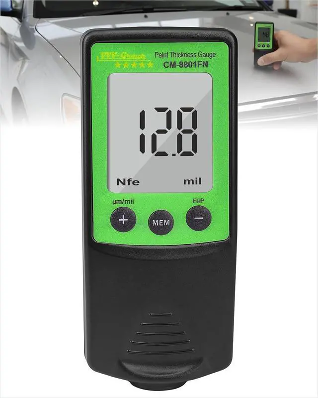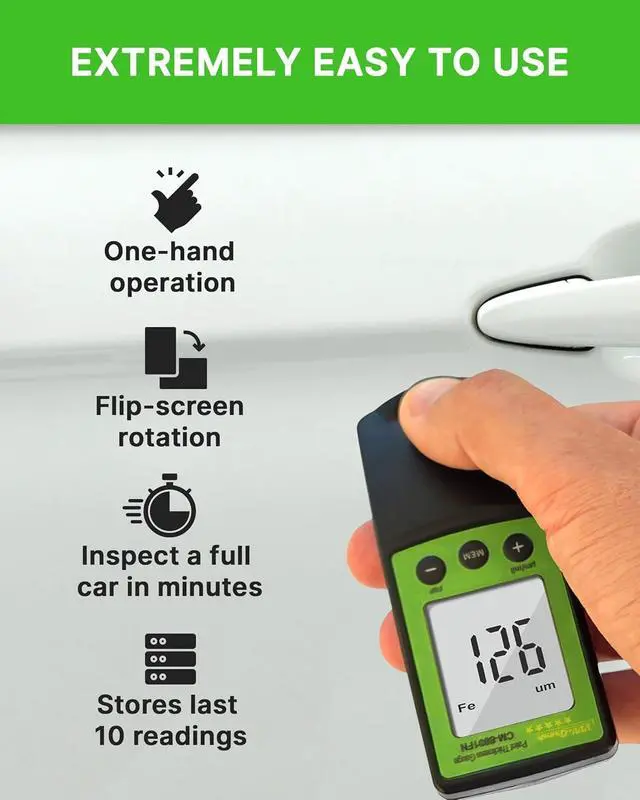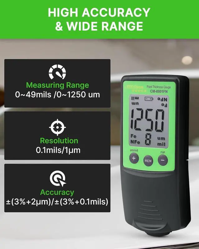 OPTIMIZED MEASURING RANGE FOR AUTOMOTIVE USE Measuring range 01250 m (049 mils) covers factory paint thickness, repainting layers, and thicker coatings commonly found on repaired vehicle panels. Suitable for automotive inspection tasks where consistent, fast, and practical coating thickness measurement is needed across painted metal surfaces.