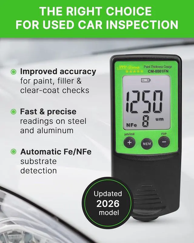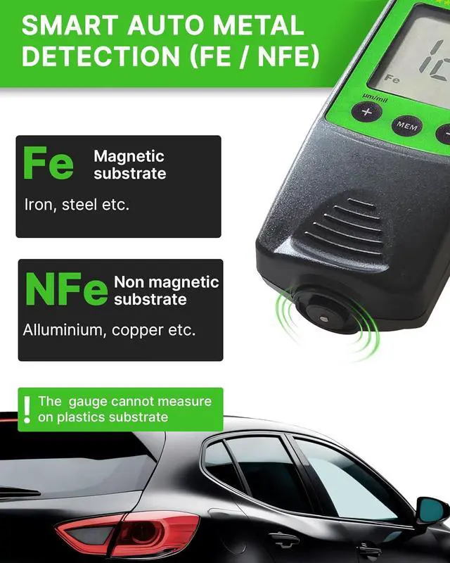 AUTOMATIC Fe / NFe SUBSTRATE DETECTION Automatically detects Fe (steel/iron) and NFe (aluminum/copper) and selects the correct measuring method. Ideal for modern vehicles with mixed body materials and accurate results without manual switching. This helps users inspect steel and aluminum body panels with one compact device and without changing measurement settings by hand.