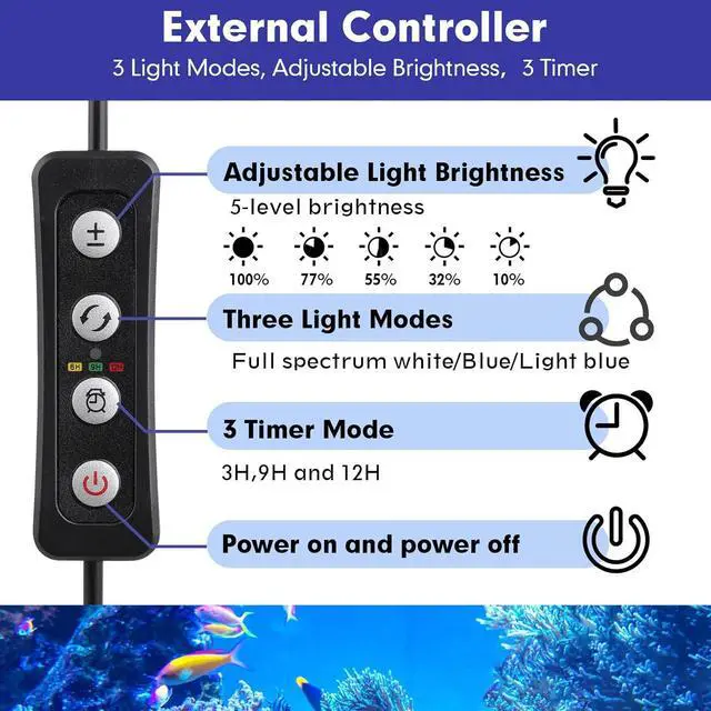 Set time (TIMER key): 6 hours, 9 hours or 12 hours; adjust brightness (up/down keys): 10%, 32%, 55%, 77%, 100%; switch light color (cycle key): blue, white-blue, full-spectrum white. Just plug and play, and dimmable with touch control, very easy to operate