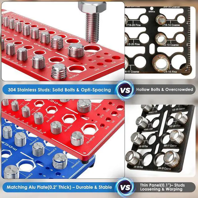 Quick and Precision Identification: Nut and bolt thread checker is made of CNC-machined anodized aluminum alloy plate and hardness 304 stainless steel studs, ensuring maximum thread strength and ultimate precision. Identify any bolts and nuts in seconds, no more guessing size or using mismatched hardware.