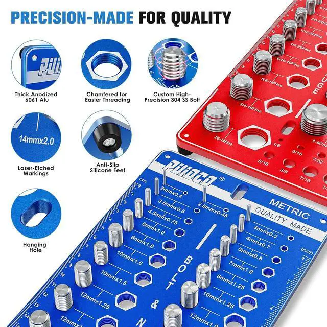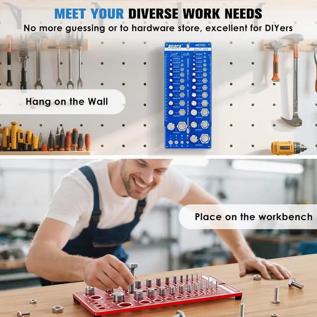 Separate Dual-Board Design: The thread checker standard and metric is split two-piece design, easier to hold in one hand and identify threads anywhere and anytime. Compact design and space-saving. Features 4 hanging holes and 8 anti-slip silicone feet, suitable for hanging on the wall or using on the workbench.