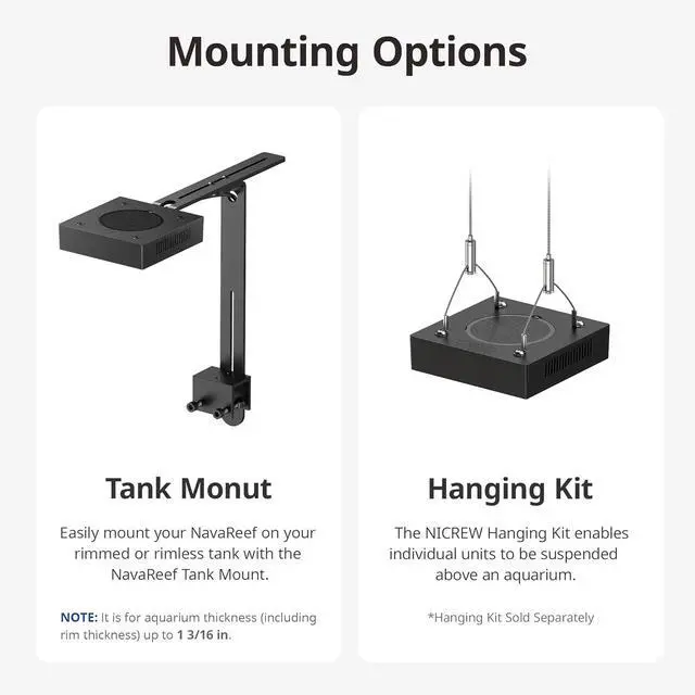 Compatible with standard Tank Mount (included) supporting rimmed/rimless tank and optional Hanging Kit (sold separately) for open-top installations