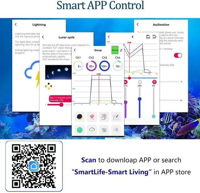 Professional reef lighting trusted by experts and hobbyists. Higher PAR output and more uniform lighting than standard reef lights. Calibrated color space delivers nearly 100% spot-free illumination. 16 built-in professional lighting modes: seasonal, lunar, lightning, and depth-specific spectra. Presets for SPS, LPS & mixed, soft coral & fish tanks, and slow acclimation. Customizable 16-point daily schedule with 4-channel independent dimming. Multi-light sync control for consistent tank-wide lighting. WiFi enabled for remote app control anywhere.