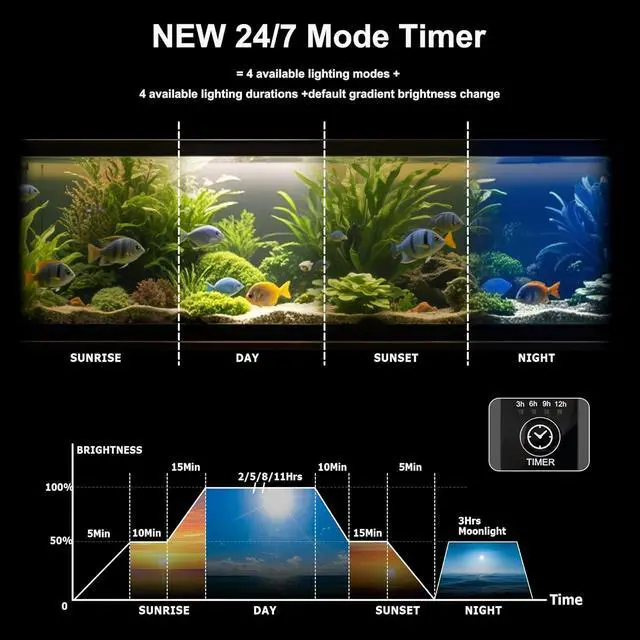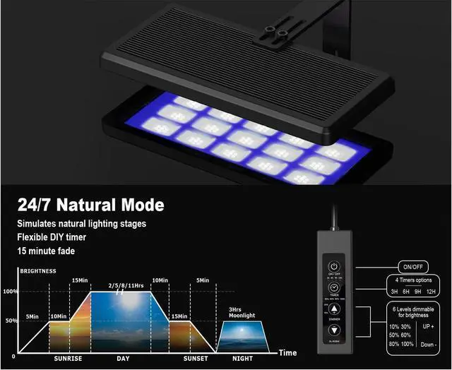 Features a sturdy aquarium light riser for easy high and low setups useful for small and big fish tank or planted aquarium light needs.