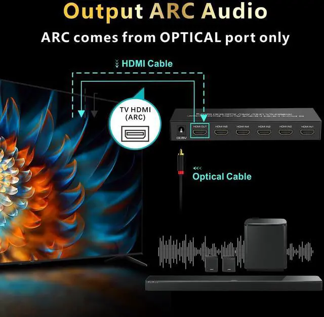 note: DO NOT support eARC; ARC audio comes from optical and HDMI port, not 3.5 mm jack; TV needs to be ARC capable