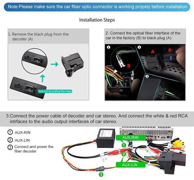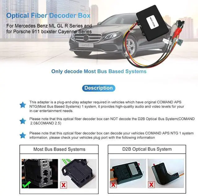 [IMPORTANT NOTE]: Some car models require an additional fiber optic cycle adapter. (It has more than 2 optical fiber interfaces in the original car. ) Or please contact the seller for support. No sound after installation or a few minutes after the console starts. You need to determine if the original vehicle comes with original car navigation, satellite box and CDC.