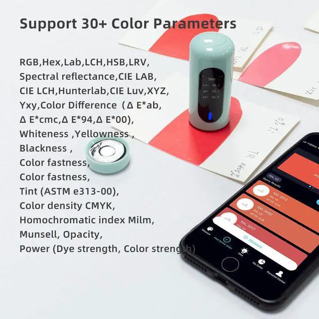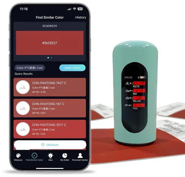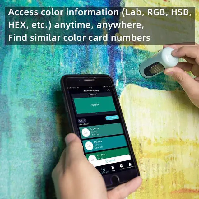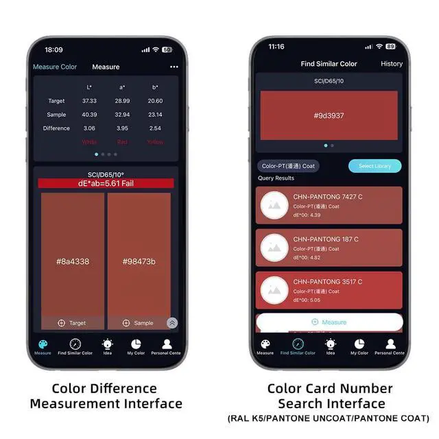 What the APP can doIn the APP, you can store a large number of color values and save them to your own color library, you can name each color, note the recipe and other information. You can also find the close color in the existing electronic color card, Ral K5, Pantone Coat, Pantone Uncoat. you can measure the color difference whether it is qualified or not, and use it in the QC session, you can check the color bias of 2 colors, whether it is reddish or blackish, and assist you to adjust the color.