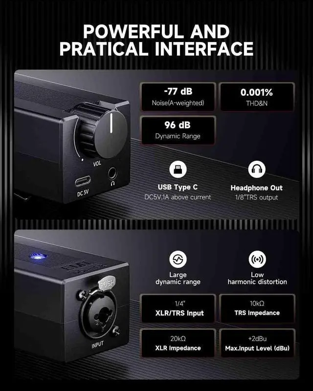 High Power - High power headphone amplifier suited for high-impedance professional headphones, ensuring sufficient volume in noisy surroundings. (Don't support the microphone.)