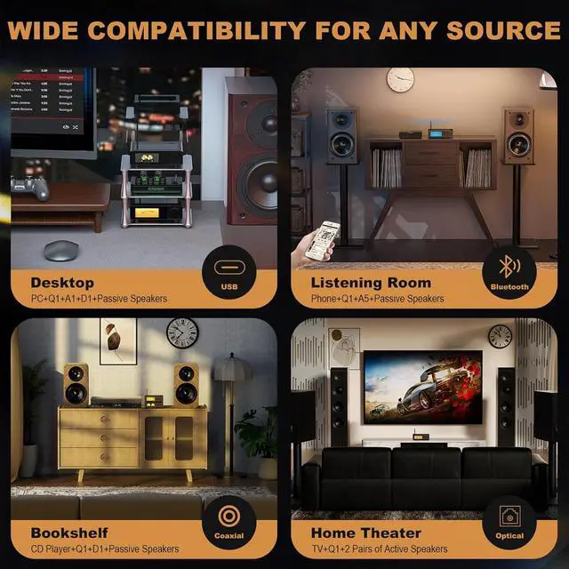 Output Versatility: Supports USB-C with UAC 1.0 / 2.0 modes for wider compatibility, including gaming consoles, plus Bluetooth with aptX/aptX-HD, coaxial, and optical inputs. Q1 has 2xRCA and 2xbalanced TRS outputs, powering up to four amps or active speakers at once. A 3.5 mm headphone jack offers personal listening with 1000mW output and two gain levels for optimal performance with both IEMs and high-impedance headphones.