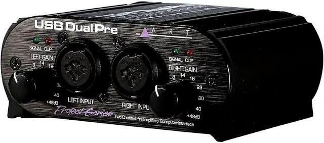 The USB Dual Pre is a full-featured high quality dual portable preamplifier and computer interface packed into a compact rugged case. It is designed to work over a wide variety of applications from remote field recording to desktop/studio tracking. Each of the two low noise input channels has up to 48 dB of clean gain with signal present and clip LED indicators. Inputs can be either XLR balanced or 1/4-inch TRS. Each of the 1/4-inch TRS outputs is buffered low impedance balanced. USB Dual Pre Project Series Applications: USB Dual Pre is powered via the USB bus. Internal 9 Volt battery, or optional external 12V power supply (or any combination of USB, battery & power supply) can be used depending on application. When running powered by battery alone, you should expect in excess of 50 hours of operation with phantom power off. Battery life will drop to approximately 20 hours (depending on microphone) when phantom powering is engaged (still enough time to get through an average session). Built-in low noise +48 Volt phantom power supply allows you to power up to 2 microphones as well as the preamplifier when running from any power sources including the USB bus. 1/8-inch TRS mini headphone jack with level and monitor mix controls on the rear allow for latency free local monitoring of the inputs while recording as well as playback monitoring of the USB bus. monitor mix is also routed to the 1/4-inch TRS balanced outputs. This lets you use the 1/4-inch outputs as either preamplifier outputs or as the monitor feed to your powered monitors. Fully compliant with the USB 1.1 specification and uses USB adaptive mode for playback and USB asynchronous mode for record.