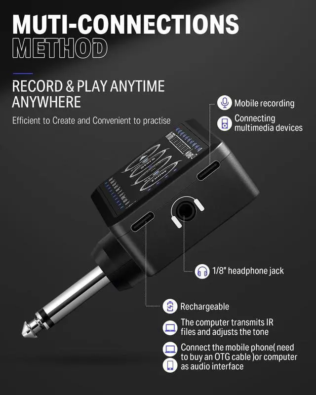 Multi-effect mini guitar ampThe headphone amp is greatly suitable for daily practice and travel. You could play the guitar with the practice amp anytime anywhere.