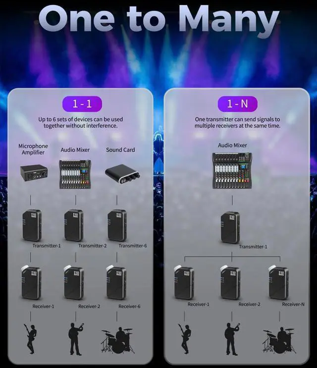 One to Many: This in ear monitor system is more cost-effective and simplifies setups compared. It supports a single transmitter sending signals to multiple receivers simultaneously. Otherwise, turn on one transmitter and one receiver to complete the one-to-one pairing, then power them off in the same environment. Repeat this process with the second set of devices (Up to 6 sets can be used at the same time).