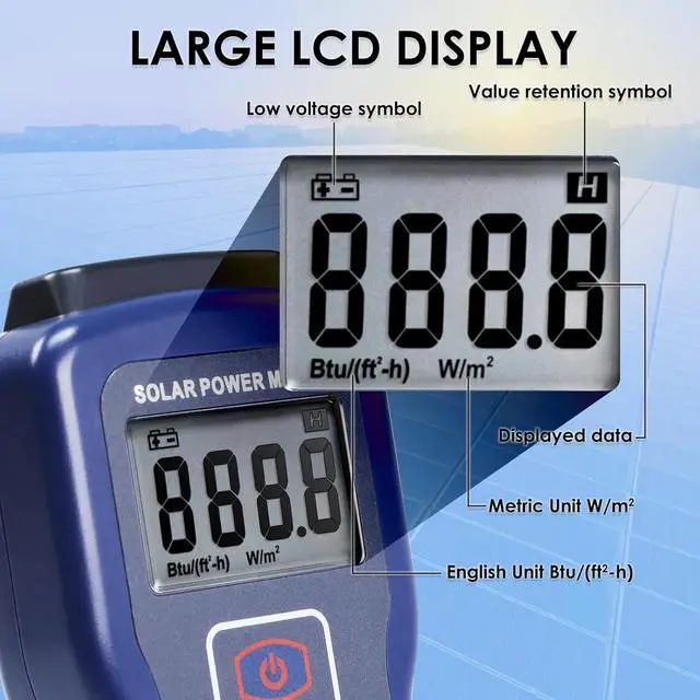 Large LCD Display The digital solar power meter is equipped with large LCD display, the maximum displayed numerical value is 19999