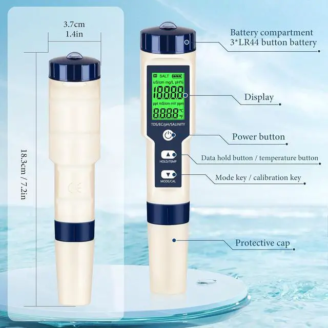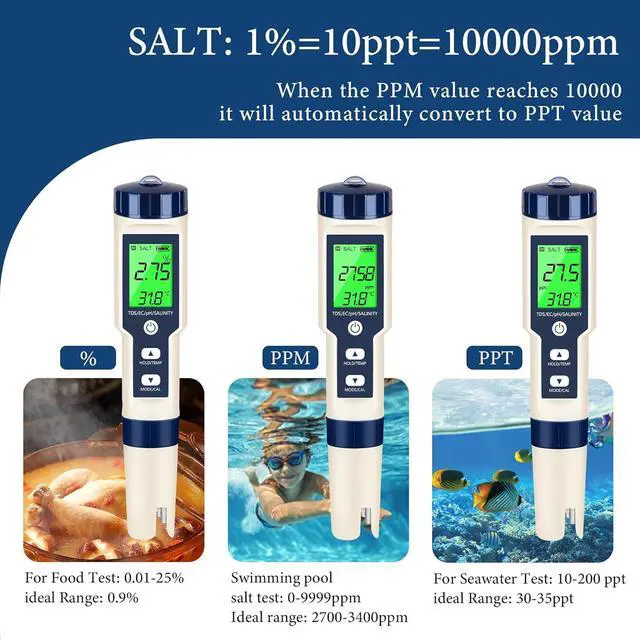 Seawater Test: 10-200ppt (1ppt=1000ppm, when ppm figure is over 9999ppm, the meter automatically changes to ppt ).