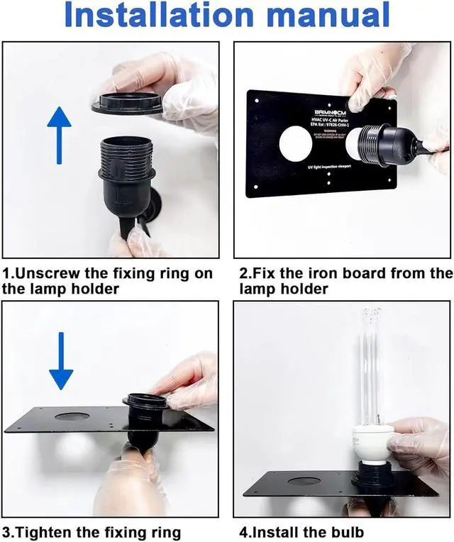 InstallationInstallation is easy 15 min or less, just cut 2 holes in your duct-work (template included), slip the lamp inside and and plug it in 6 ft cord
