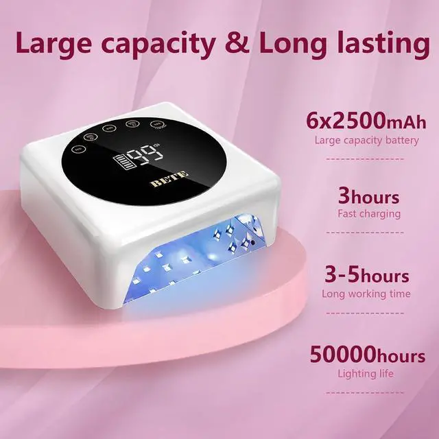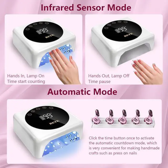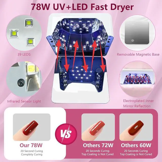 39PCS Beads and Dual WavelengthThis nail dryer has 39pcs LED beads with maximum 78W power, and dual optical wavelength(365nm+395nm) lamp beads, can quickly solidify various types of nail polish from all angles