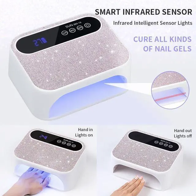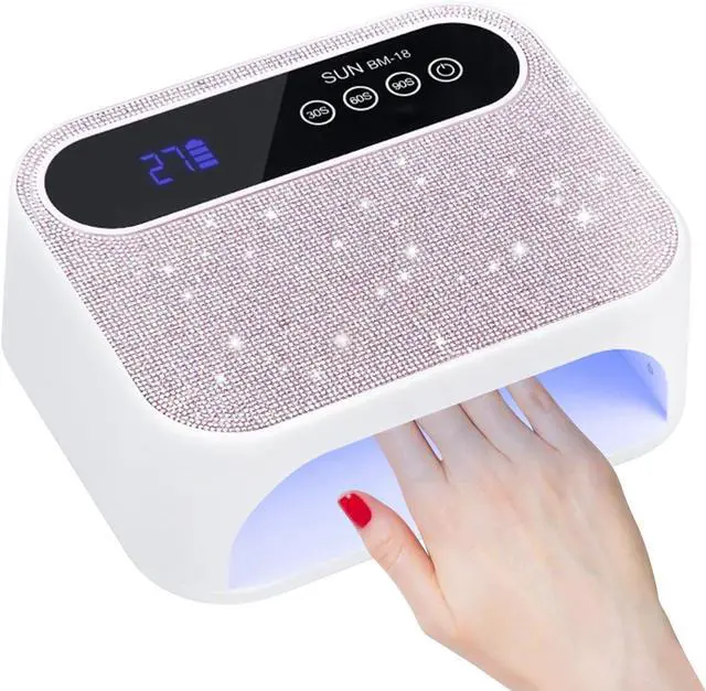 Smart Auto Sensor & Gentle Light sparkly diamond uv nail lamp cordless features intelligent infrared sensor functionhand in, light on, hand out, light off. This fully automated curing lamp can free your hands and offer a new salon nail experience. Dual LED + UV light source emitting gentle 365+405nm light which is gentle and friendly for your skin. Will not glaring/scorching or tan your skin.