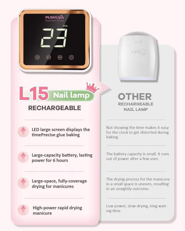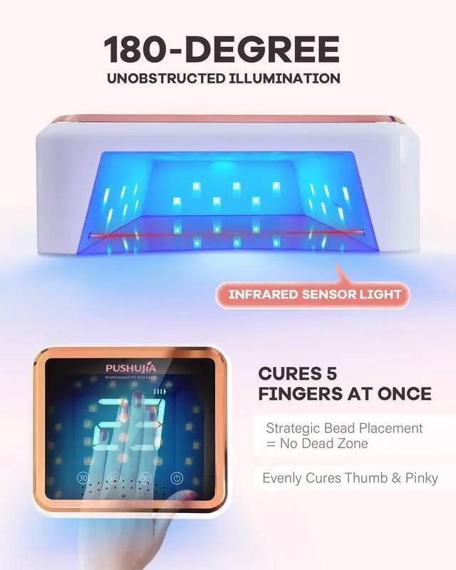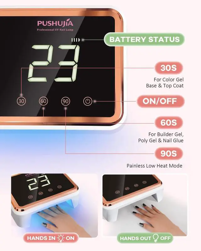 & -: Easily switch between 30s, 60s, and 90s timers to meet different gel requirements. For energy saving, the device features a 300-second auto-off function when left idle.