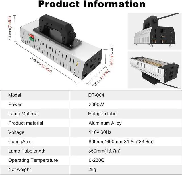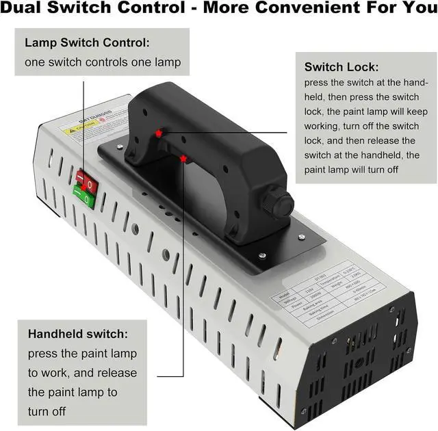 EASY OPERATIONInfrared paint curing lamp is equipped with double switch control, two switches respectively correspond to a lamp tube, independent design, easy to operate. In addition, there is a touch switch on the handle, press it to light, release it to turn off, you can also lock the switch, so that the paint lamp continues to work. This paint lamp can greatly improve the convenience of your work.