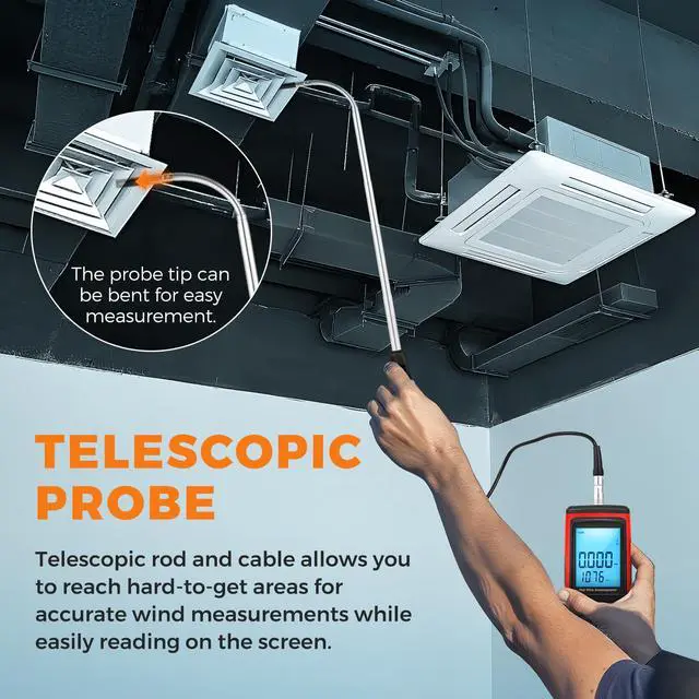 Long Probe: 1.08 m long telescopic rod and 1m long cable allow you to reach hard-to-get areas for accurate wind measurements while easily reading on the screen. And the probe tip can be bent for easy measurement.
