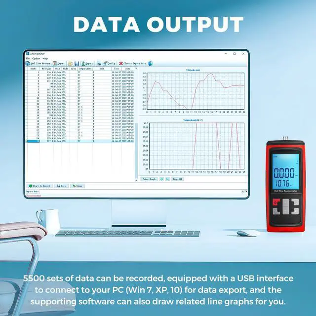 Data Output: 5500 sets of data can be recorded, equipped with a USB port to connect to your PC (Win XP, 7, 10) for data export, and the supporting software can also draw related line graphs for you.