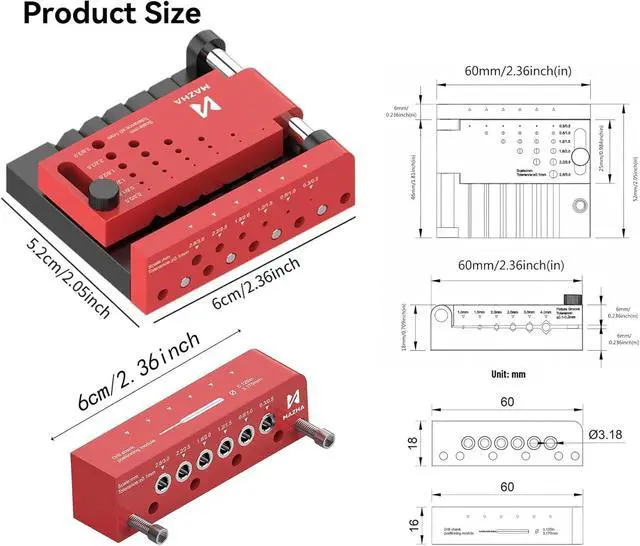 Product Description: The apertures of the positioning screws are 0.3 -3mm respectively, which can be installed accordingly and assist in accurate hole opening. They are suitable for the center hole opening of glue sticks with a diameter of 1-4mm, and can be made with vertical and horizontal holes.