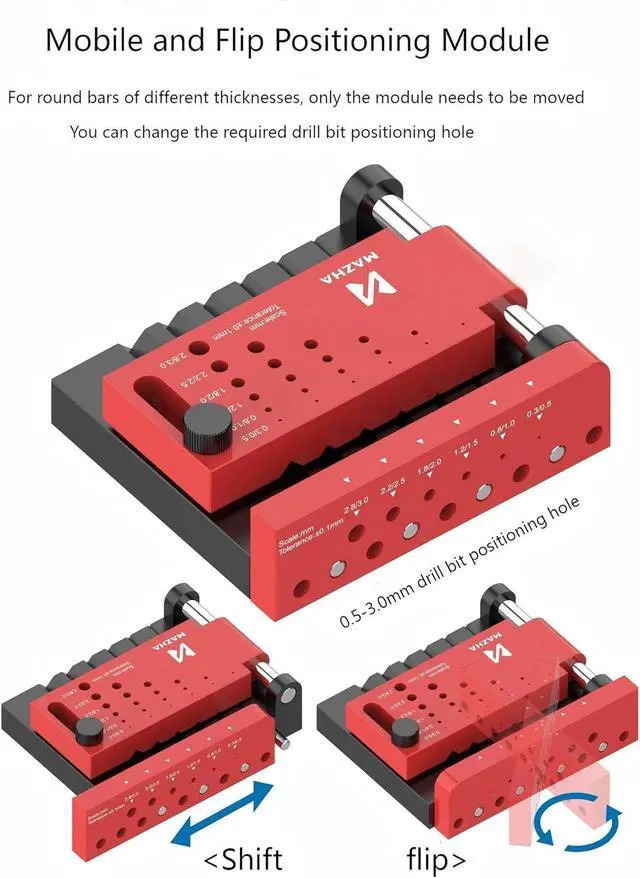 Professionally Designed: Depending on the different diameters of round bars, merely by moving and flipping the positioning module, you can alter the drill bit locating hole as required. And you can adjust how tightly the round bar is clamped by turning the compression screw.