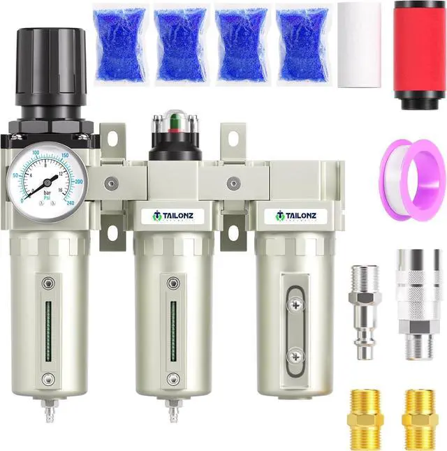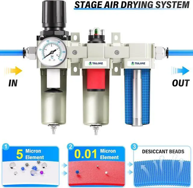 Package included1x Three Stage Air Drying System, 1x Dial Gauge for the 1/4", 1x Nickel-plated Iron Air Plug, 1x Nickel-plated Iron Air Coupler, 2x 1/2" × 1/2" Male Pipe, 2x 5 Micron Element & 0.01 Micron Element (One of Them is Installed in the Product), 4x Desiccant Beads Bag, 1x Teflon tape.
