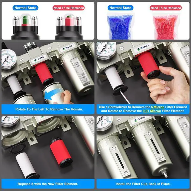 Stage 3 Desiccant Air DryerThe air will pass through a metal bowl filled with desiccant, which can thoroughly dry and clean the moisture and impurities in the air, and finally output to downstream pneumatic tools. When the desiccant needs to be replaced, the beads will change from blue to pink.