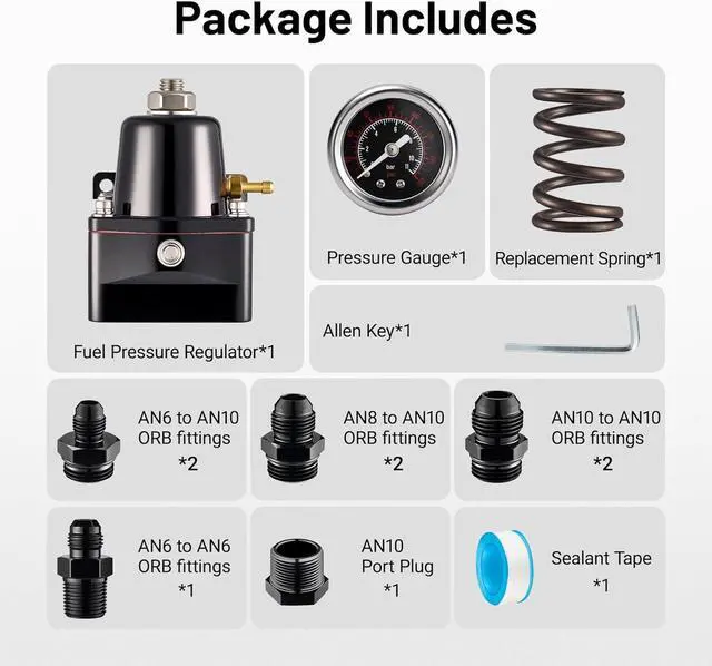 [Package]Includes 1xfuel pressure regulator, 1xpressure gauge, 1xreplacement spring, 1xAN10 port plug, 1xallen key, 1xsealant tape, 1xAN6 to AN6 ORB fitting, 2xAN6 to AN10 ORB fittings, 2xAN8 to AN10 ORB fittings, 2xAN10 to AN10 ORB fittings.
