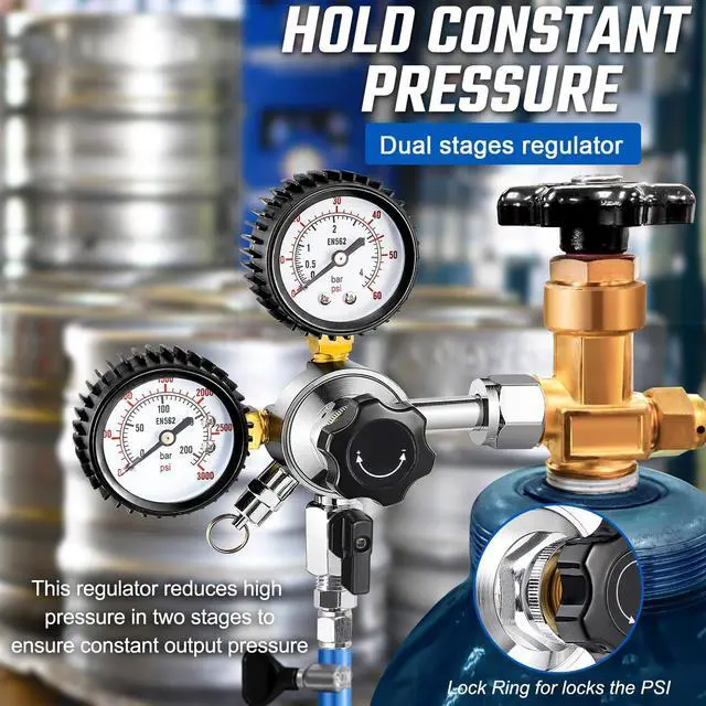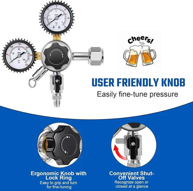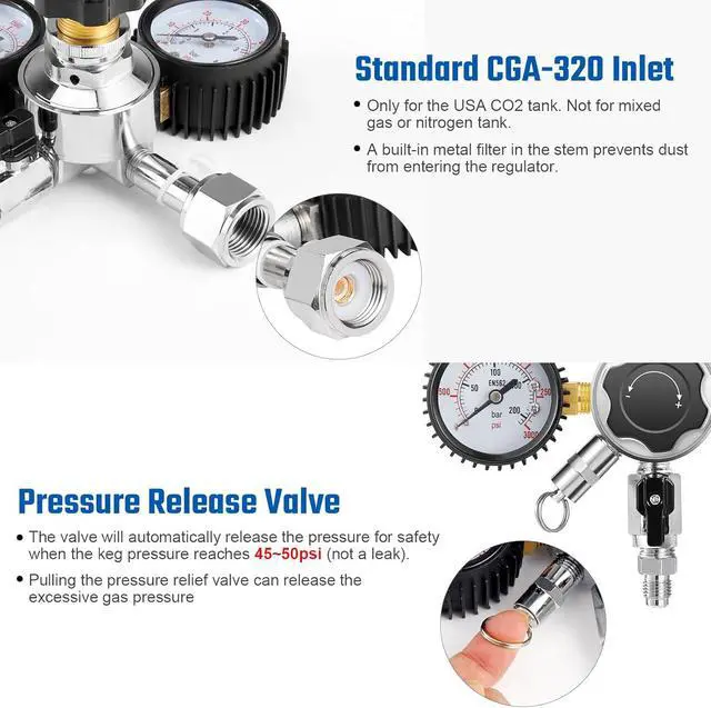[Solid Constructions&No Leak] Heavy-duty chrome-plated brass construction would last for years with no rust. The beer keg regulator is supplied with sealing washers. Pacing a washer between the CGA-320 inlet and the tank ensures a tight seal, no CO2 leak!