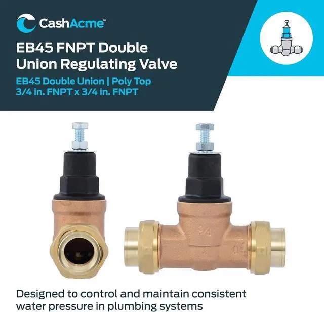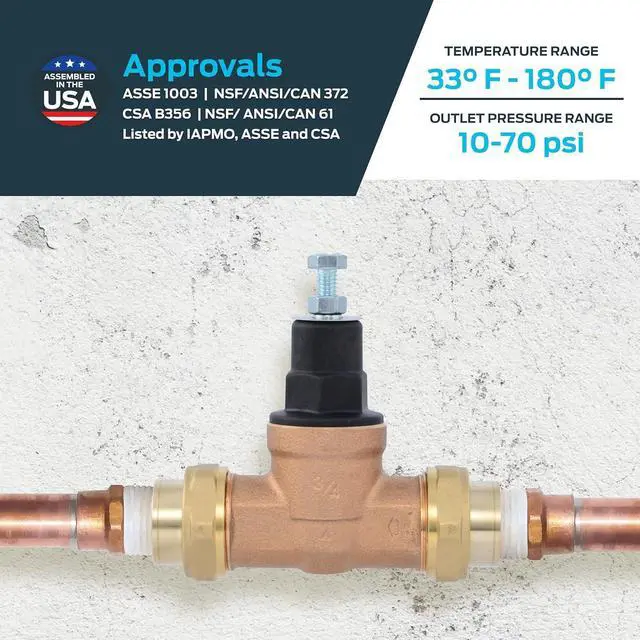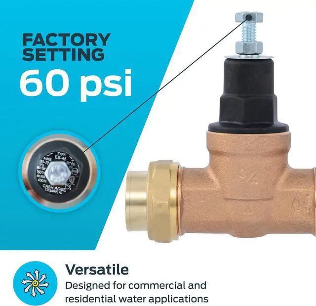 Keep water pressure regulated in any commercial or residential setting with this direct pressure regulating valve. Designed to prevent surges and maintain consistent flow, this water pressure regulator features a tamper-resistant EB45 design that locks in the desired pressure. Its innovative mechanism allows for quick, tool-free installationjust insert the pipe, and the stainless steel teeth grip tightly while the O-ring compresses for a secured seal. This regulating valve is made from lead-free and durable brass. Rated to 60 PSI and adjustable from 10 to 70 PSI, these regulating valves support both hot and cold water up to 180 degrees F.