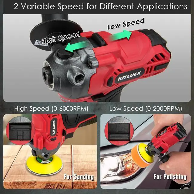 Variable Speed Control2 level variable speed from 0-2000RPM and 0-6000 allows you to choose the suitable speed of car buffer machine according to different applications freely without stopping the polishing machine. Low speed is recommended for waxing, polishing, buffing; High speed recommended for sanding. You can also adjust the buffing machine speed according to different materials to help you improve work efficiency.