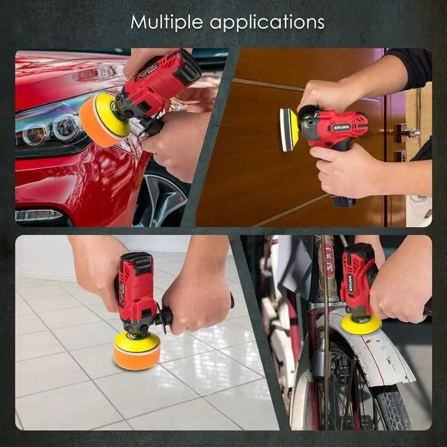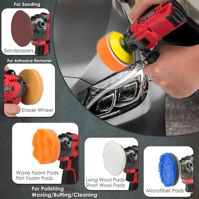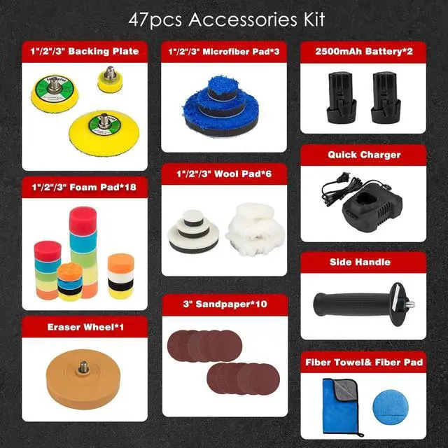 What You Get In Car Buffers And Polishers Kit Cordless Car Buffer Polisher Machine; 1"/2"/3" Backing Plate (3pcs), 1"/2"/3" Foam Pad (18pcs), 1"/2"/3" Microfiber Pads (3pcs); 1"/2"/3" Long Wool Pad (3pcs), 1"/2"/3" Short Wool Pad (3pcs), 3" Sandpaper (10pcs), Eraser Wheel, Anti-Vibration Side Handle, Fiber Towel& Fiber Pad (2pcs), 2500mAh Battery (2pcs), Quick Charger, User Manual.