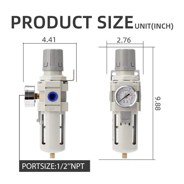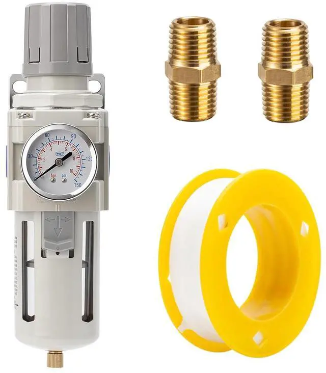 AIR COMPRESSOR REGULATOR: Includes Semi-Auto Drain & Polycarbonate Bowl, 0-150 PSI Gauge, 2 x 1/2" NPT plug, 1 x Thread Seal Tape